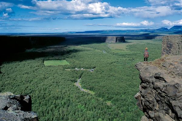 Ásbyrgi is one of the wonders of nature, a wide, horseshoe-shaped canyon with sheer cliff faces up to 100 m high. It is 3.5 km long and over 1 km wide. At its innermost end lies Botnstjörn, a small pond surrounded by luxuriant vegetation. A distinctive rock formation rises up from the centre of Ásbyrgi, up to 250 m wide, known as Eyjan.